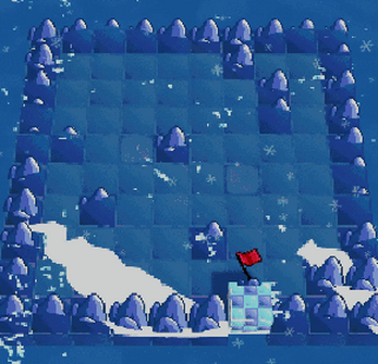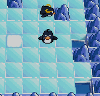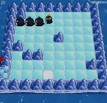 You control the royal penguin, caracterised by his golden hair. He can slide in any direction, but he will move until he hits a wall. When you slide over a penguin, he gets collected and stacks over the royal penguin. Now whenever you move, the final position will be further from the wall, depending on the number of penguins you have joined together. Snow tiles allow penguins to stop directly on them. Holes need to be avoided.